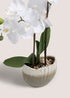 Add a touch of elegance to your space with this stunning Orchid in a Vase. Perfect for enhancing your home or office decor, this arrangement exudes sophistication and timeless beauty. Featuring a lifelike orchid with delicate blooms and lush green leaves, artfully arranged for a natural appearance.