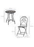 Learn moreThis garden bistro set for 2 from Outsunny, will allow you to enjoy outdoor places in style. The unique design of ceramic tile brings beauty into your patio, garden, balcony, and anywhere you need this folding garden furniture. The sturdy metal frame with stylish pattern fits well with the ceramic tile tabletop and seats. What's more, the garden bistro sets are foldable and space-saving to store.