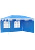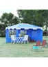 Learn moreCreate a shaded space for any special occasion with this blue gazebo by Outsunny. It boasts a powder-coated steel frame and water-resistant PE fabric to protect you and your guests from rain and searing sun. Ideal for family parties, picnics, weddings, sports events and craft fairs, this marquee features two sidewalls, one of them complete with two PVC church windows, and a white wavy edge design finish. Total Dimensions: 395cm x 295cm x 255/200cm. Tube Size: 32mm x 0.5mm / 24mm x 0.38mm. Please note: Not suitable for blustery, high wind conditions. Features: Extra 16mm x 0.38mm tough steel tube on two sides for added strength. Sturdy construction. Easy assembly. Assembly parts, full instructions and ropes and stakes included. White steel tubes with durable PP connectors. Two side walls included.