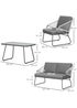 Learn moreOutdoor relaxation done stylishly right with this Outsunny rattan sofa set. Comes with a loveseat, two chairs and a matching coffee table. Powder coated steel frames ensure a strong, supportive core, wrapped in plastic rattan for a stylish and protective shell. The thick seat and back cushions ensure comfort