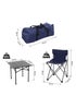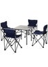 Learn moreEnjoy total comfort on your next camping trip with this five-piece set from Outsunny. It includes four chairs and a table, each made with heavy-duty steel that's tough, reliable and durable for outdoor use. The chairs feature cross-over legs, together with foot pads for extra stability. The seats are made from tough and weather-resistant 600D Oxford cloth to keep them clean even in light wind and rain, with the high backs providing added support as you lean back. The table comes in two parts, with a base and roll-up table top that can be stored away easily in the included carry bag. Carry bag included. Flat pack. Easy to assemble. Dimensions: Table: L 52cm x W 52cm x H 50cm. Chairs: L 42cm x W 42cm x H 65cm. Carry bag: L 28cm x W 22cm x H 65cm. Seat height: 38cm. Weight capacity: 80kg (chair),10kg (table). Net weight: 8kg. Features: Five-piece set, featuring four chairs and a table Heavy-duty steel frame, is tough, reliable and durable for outdoor use, with cross-over bases and foot pads to ensure each piece is stable. 600D Oxford cloth seats are light weather-resistant and breathable. Two-piece table, with a roll up tabletop for compact storage and easy carrying. Carry bag included, easy to assemble. Specifications: Brand Name: Outsunny. Colour: Blue and Black. Material: 600D Oxford Cloth, Metal Table Size: 52L x 52W x 50H cm. Chair Size: 42L x 42W x 65H cm. Carry Bag Size: 28L x 22W x 65H cm. Seat Height: 38cm; Weight Capacity: 80kg(chair); 10kg(table). Net Weight: 8kg. Flat Pack: Yes.