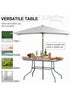 The perfect centrepiece for your outdoor setup, this sleek and stylish garden table by Outsunny will help you make the most of al fresco dining. With a versatile appearance that pairs well with several other styles of outdoor furniture, the smooth, curved frame of the table is fashioned from sturdy metal, complete with four evenly spaced legs for balance, and topped with smooth and strong Aquatex glass. A handy parasol hole in the middle of the table completes the design. Umbrella Hole Diameter: 3.8cm. Assembly Required. Please click here for assembly guide.