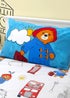 Adored by young and old alike for generations, this officially licensed Paddington Bear bedding set is perfect for any young Paddington fan. The bedding set is designed single beds, and includes a reversable duvet cover and a reversable pillowcase, so you can freshen up the look of your child’s bedroom. The front side of the duvet cover features a large print of Paddington Bear in his blue duffle coat and red hat, stood in front of a red London bus going to Windsor Gardens, with a sketched style lamppost and Big Ben, set in front of a water colour style blue sky. The matching pillowcase features Paddington with his suitcase in front of a sunny blue sky with a single cloud. The reverse side features a repeating pattern of Paddington eating a marmalade sandwich, a red phone box, a London bus, and Big Ben on a white background, with matching pillowcase. The bedding is made from recycled materials, and printed to a high standard. Made from a cotton polyester blend, the bedding features popper closing so it’s easy to remove and wash. The duvet cover and pillowcase are machine washable, and tumble dryer safe at a low temperature. Designed for single beds, the duvet cover measures 135 x 200cm, and the pillowcase is a standard UK size of 74 x 48cm