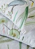 Add serenity to your home with exotic and majestic birds gliding through aquatic foliage. With hints of Japanese inspiration this design is soothing and harmonious, featuring a soft palette of tranquil greens and greys. This duvet cover set has a plain, tonal colour reverse and a complimenting piped edge adding a seamless finish.