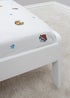 Bright, colourful, and fun, the heroic pups of Paw Patrol are loved by children. This officially licensed Paw Patrol fitted sheet is designed for junior beds and toddler cot beds, and has elastic all the way around the hem. The mattress cover fitted sheet features a repeating pattern of Chase, Skye, Marshall and Rubble with blue paw prints on a white background, with the pattern running all over the sheet. Designed to fit junior beds with a standard depth mattress, the all-around elasticated fabric holds the fitted sheet in place, and makes it super easy to fit or remove and wash after accidents. Machine washable and tumble dryer safe at low temperatures, the Paw Patrol fitted sheet can be washed and dried quickly. Made from recycled and responsibly sourced polycotton, the sheet is breathable, warm, and kind to skin, while being considerate to the environment. Suitable for toddler, junior beds and cot beds, the sheet fits mattresses measuring 70 x 140 x 18cm, so it’s perfect for children and toddlers that love Chase and the gang.