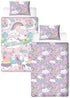 Officially licensed by Peppa Pig, the single bed duvet cover and pillowcase bedding set is perfect for young children and makes for a great gift. One side of the reversible duvet cover features a dream world pattern of Peppa Pig floating on clouds, Suzy Sheep as a fairy, and George sitting on the moon, with stars and rainbows and ‘Always Dreaming’ messaging, set on a soft pink background. The reverse side features Peppa Pig and George playing together on a rainbow, with Suzy Sheep as a fairy with a unicorn, with stars and clouds and set on a purple background with a matching pillowcase.