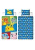 The reverse side features a repeating pattern of Pokeballs, Charmander, Squirtle, Bulbasaur and Pikachu on a blue background with a matching pattern on the pillowcase. Made from a polycotton mix of responsibly sourced cotton and recycled polyester.