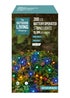 200 multi-coloured battery operated LED string lights with a 15.9m lit length on a green cable with 0.3m lead length to the battery pack. Multi-action with 8 functions. Features a timer function that switched on for 6 hours and off for 18 hours. Suitable for indoor and outdoor use.