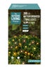 200 warm white battery operated LED string lights with a 15.9m lit length on a green cable with 0.3m lead length to the battery pack. Multi-action with 8 functions. Features a timer function that switched on for 6 hours and off for 18 hours. Suitable for indoor and outdoor use.