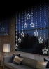 Silver and white star curtain light with a lit area of 1.2 meter by 1.2 meter. 303 white static LED bulbs in silver wire. 9 sparkling stars hung from wires of varying lengths to create a lovely festive lighting effect in windows. Easy to hang and suitable for indoor and outdoor use. Mains operated with a 5 meter cable to the first bulb.