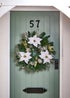 60cm green wreath decorated with stunning white poinsettias and sparkling silver baubles. Finished with sprigs of white winter berries and sprigs of holly.