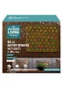 Battery operated net lights with 64 cool white LEDs on a green wire trellis. Feature 2 light settings of static or flashing and a timer function that switches on for 6 hours and off for 18 hours. With a lit area of 1 metre by 1 metre and a 2 metre cable to the battery pack. Suitable for indoor or outdoor use. Requires 3 AA batteries.