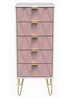 Learn moreDistinctive and modern, this Prism 5 Drawer Tallboy makes a unique and modern addition to your home. Features Gold Metal Hairpin legs and sleek metal handles. Comes in a scratch resistant soft pink and white smooth matt finish, with distinctive "Diamond" patten fronts. Features drawers with linen effect linings on smooth high quality metal runners. Dimensions (HxDxW): 107.5cm x 41.5cm x 39.5cm Manufactured to order in the UK. 12 Month manufacturer Warranty. Delivered by our 2-Man delivery teams to your home and room of choice. Please note if the item has legs, these will be removed and sent in a separate box to avoid damage in transit. Please note we currently can ony deliver to a UK Mainland address.