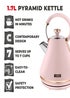 Add contemporary style to your kitchen with this elegant Cavaletto Pyramid Kettle from Tower. It features a matte pink finish with lustrous rose gold accents, making this kettle an eye-catching addition to any countertop. Full of modern functionality, it's powered by rapid boil technology to reduce your wait for a delicious hot drink, boiling 1 cup in less than 45 seconds. A large 1.7L capacity lets you make up to 7 drinks from a single fill, ideal for families and busy households alike. With a detachable filter, you can easily remove and rinse away limescale to keep your coffee and tea tasting its best. The perfect pour spout protects against boiling hot water spillages, while the 360-degree swivel base and fully-removable lid make it simple to lift and refill the kettle no matter whether you're left or right-handed.