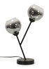 Add a touch of industrial style and character to your home with this black metal table lamp. Featuring a two way design with smoked glass lampshades. The in-line rocker switch provides convenient control, making it easy to illuminate your space. Transform your room easily with this simple yet stylish design. Perfect for adding a minimalist touch to your living space. Requires 2 x LED 4W SES E14 bulbs (not included).