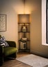 Transform your room in seconds with this wooden crafted floor lamp. Featuring 3 spacious shelves for your home decorative accessories and a built in lamp, encased in a triangular grey shade. The triangle shape can be pushed into the corner of the room providing you a large space saving solution whilst also making it look attractive and decorative. This lamp can easily be switched on and off by gently pressing with your foot. Bulb Required: E27
