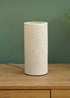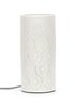 Designed in a white ceramic finish, this lamp will dress your home with its eye-catching texture. The porcelain cylinder base features an intricate cut out damask detailing which allows the light to disperse evenly around the room. The perfect choice for any modern home that loves a neutral palette. The in-line rocker switch provides convenient control, making it easy to illuminate your space. Requires 1 x LED 4W SES E14 bulb (not included).