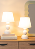 A pair of Winnie touch table lamps in cream. A stacked globe design with a matching tapered shade. Perfect for bedsides. Requires bulb with SES E14 fitting.
