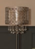 This traditional and ornate floor lamp features a beautiful Moroccan inspired design. Complete with clear jewel droplets that dangle from inside the drum shade. The intricate cut out metal detailing allows the light to disperse evenly around the room. Transform your room easily with this elegantly crafted floor lamp. Requires 1 x LED 6W ES E27 bulb (not included).