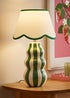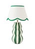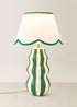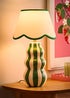 The Everie ceramic table lamp combines playful pattern with coordinated detailing. Its sculptural base features vertical green stripes, paired with a scalloped fabric shade edged in a matching green trim for a polished finish. Designed to add both character and function, Everie provides a soft, ambient glow that suits bedrooms, living spaces and hallways. A versatile design that can stand alone or complement other dopamine décor pieces. Bulb Required: E14