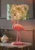 Add some character and charm to your home with this flamingo table lamp. Complete in a pink velvet finish with a tropical palm tree lampshade, this lamp is sure to be a showstopper that will brighten any room. The in-line rocker switch provides convenient control, making it easy to illuminate your space. This table lamp is a unique piece of lighting that will add a touch of personality and style, transforming your room in seconds. Requires 1 x LED 4W SES E14 bulb (not included).