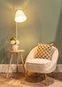 Add a contemporary element to your decor with this dual function floor lamp. Featuring a white metal stem with a tripod base and built in table, which is ideal for displaying ornaments, pictures and other decorative items. Complete with a fabric tapered lampshade. This lamp can be placed into the corner of the room providing you a large space saving solution whilst also making it look attractive and decorative. This practical but stylish light has a braided flex with an in-line on/off foot switch for easy use. This lamp is easy to assemble, making it simple to enjoy your new lighting addition. Requires 1 x LED 6W ES E27 bulb (not included).