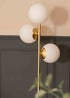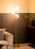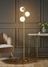Introduce elegance to your living space with this three way floor lamp. Featuring three white glass globe shades contrasted against a slim metal stem in a gold finish. This lamp creates a modern yet cosy glow to your space, whether that's beside the dining table or ambient lighting for your living room area. Please note - we have matching items available in our shop. Requires bulb with G9 fitting