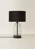 Add a timeless addition to your home with this black table lamp. Featuring a glass base with a simple, modern design that complements any decor. Whether your style is vintage or minimalist, this lamp will fit perfectly into any room in your home. Complete with a velvet lampshade. This product features an in-line on/off rocker switch making it easy to turn the light on. Requires 1 x LED 4W ES E27 bulb (not included).