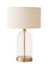 Add a timeless addition to your home with this gold table lamp. Featuring a glass base with a simple, modern design that complements any decor. Whether your style is vintage or minimalist, this lamp will fit perfectly into any room in your home. Complete with a boucle lampshade. The natural texture of the fabric adds warmth and depth to your home. Requires 1 x LED 4W ES E27 bulb (not included).