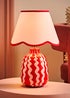 The Katy pink and red wiggle stripe table lamp blends contemporary playfulness with functional lighting. Its bold ceramic base in pink and red stripes is paired with a scalloped pink shade trimmed in red, creating a striking silhouette that lifts any room. Ideal for eclectic, retro or modern interiors, Katy works beautifully in living rooms, bedrooms or hallways. This table lamp is a bold statement on its own or can be styled alongside softer pieces for a balanced, curated look. Bulb Required: E14