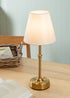 Our traditional design cordless table lamp makes a real statement in your personal space. The warm white light has three levels of brightness to give you the perfect level of luminous glow. This touch table lamp is crafted from gold metal with a fabric shade and comes complete with a 1.5M USB charging cable. The recommended charging time for full charge is 4 hours to get 7 hours glow time. Whether your style is modern, or more sleek and minimalist, this lamp will fit perfectly into any room in your home. Includes integrated LED bulbs.