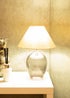 This table lamp features a glass base making it perfect for adding a sleek and contemporary touch to any space. Complete with a fabric tapered lampshade in a natural finish. The in-line rocker switch provides convenient control, making it easy to illuminate your space. This lamp will illuminate your home while creating a visual point of interest. Requires 1 x LED 4W SES E14 bulb (not included).