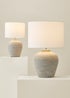 Introducing Reid, the table lamp that brings effortless style to any room! With its hand-finished stone grey ribbed ceramic base and crisp white drum shade, it’s a real statement piece. The colour-matched fabric cable keeps things coordinated, while the brushed chrome cap offers a modern edge and enhances the lamp's overall quality. Reid combines cosy lighting with contemporary flair. Available in small and large, it’s the perfect choice for any space looking for a little extra glow.