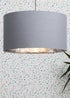 Modern cylinder drum shaped light shade in a grey polycotton finish with a chrome inner. This fantastic shade can double up as either a ceiling pendant light shade or table lampshade! Easily fits to your standard ceiling light socket - no wiring necessary! Various colour options and other sizes available. Bulb Required: E27