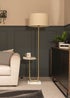 Add a contemporary element to your decor with this dual function floor lamp. Featuring a curved matt brushed gold stem with a solid marble table which is ideal for displaying ornaments, pictures and other decorative items. This lamp can be placed into the corner of the room providing you a large space saving solution whilst also making it look attractive and decorative. This practical but stylish light has a braided flex with an in-line on/off foot switch for easy use. This lamp is easy to assemble, making it simple to enjoy your new lighting addition. Complete with a large lampshade. Requires 1 x LED 6W ES E27 bulb (not included).