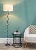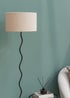 Add a touch of unique style and character to your home with this waved black metal stem floor lamp. Complete with a boucle lampshade in a cream finish. The natural texture of the fabric adds warmth and depth to your decor. The in-line switch provides convenient control, making it easy to illuminate your space. Elegantly crafted, this wiggle design lamp is perfect for illuminating any room in your home. Requires 1 x LED 6W ES E27 bulb (not included).