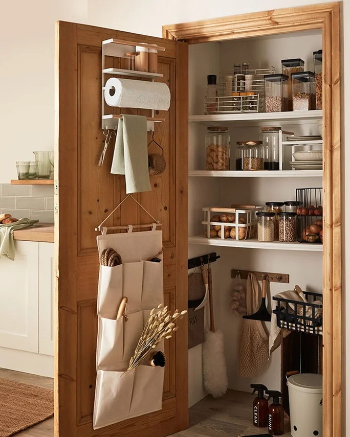 A tidy pantry makes life easier. Empty it, wipe the shelves, and use jars, baskets and labelled containers to keep everything easy to find. Hooks or organisers on the door save space, and grouping similar items keeps it simple to use.