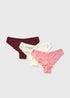Learn moreGet ready to turn heads in our 3 pack multicoloured lace Brazilian knickers! These knickers are the epitome of luxury and comfort in a plum, cream and pink colour. Crafted from delicate lace, they feel soft against your skin, providing an all day comfort. The vibrant hues add a touch of femininity and style for a confident wear.