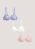 Learn moreComfortable and flattering, the T-shirt bras in this three pack come with soft padded cups and underwires for support, as well as adjustable straps for the perfect fit. In pink, white and blue floral variations, this pretty trio is finished with back hook fastenings and here to give your top drawer a refresh. Team with the matching knickers S2945956_C128 or DD+ bra S2944443_C128 to complete the look. Model Height: 5ft 9.