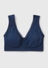 Learn moreProviding light support without the aid of wires, this simple navy crop top puts comfort at the forefront. Crafted from soft stretch fabric, this design features lightly padded, removable cups for a smooth finish, alongside a pretty lace trim and a pull-on fit.