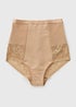 Feel confident and comfortable with these Nude Firm Control Shaping Super High Waist Briefs. Designed with a smoothing fit, they feature delicate lace detailing at the waist for a feminine touch while offering light support to flatter your silhouette. Perfect for everyday wear or special occasions, they combine practicality with elegance.