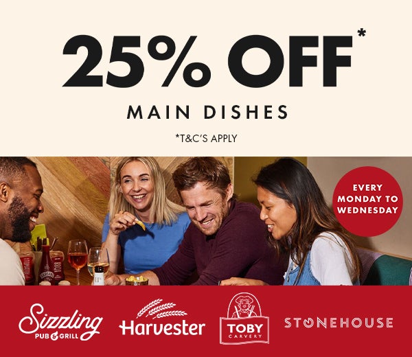*This voucher entitles you to 25% off adult main meals, for dine in or via Click & Collect. Only valid Monday-Wednesday until Wednesday 18th March 2026. Not valid on Bank Holidays or in Northern Ireland. Valid for up to 6 people at one table in the same transaction. All food must be ordered at the same time. The offer is not available on drinks, breakfast, brunch, kids' meals, add-ons and upgrades, King Size, Go Large trade-up, set menus, buffets, snacks & starters, sharers, sides, small plates or delivery through our 3rd party partner websites. Voucher can be used once per day during the redemption window. Subject to availability and cannot be used in conjunction with any other promotions, vouchers, or discount offers. This offer can be used when collecting reward stamps. Your voucher is non-transferable and can’t be exchanged for cash or used as a cheque guarantee, credit, debit or charge card. We cannot be responsible for reimbursing you if this voucher is lost, stolen or deleted. Please check your local restaurant's website as some sites may be closed. We reserve the right to amend this offer, or the terms and conditions. Promoter is Mitchells & Butlers Retail Ltd trading as Toby Carvery, Harvester, Stonehouse Pizza & Carvery and Sizzling Pubs. English Law Applies.