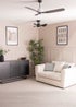 Small in size, big on style. This 24" matte black ceiling fan has three curved blades and a built-in LED light in a sleek, modern design. With six fan speeds, three light settings (6500K, 4000K or 3000K), and handy extras like a natural breeze mode, reverse spin and security lighting, it's a clever upgrade for compact spaces. Set 2-, 4- or 8-hour timers with the remote. Measures 60cm wide x 30cm high. Install at least 2.3m above the floor on a solid beam that supports 60kg. Hardwiring required. Please Note - This fan requires assembly. The remote control requires 2x AA batteries (not supplied).