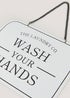 Remind everyone who enters your bathroom to put cleanliness at the forefront with this charming sign. Featuring a black metal chain for ease of hanging up, it comes complete with a 'Wash Your Hands' instruction. Dimensions: H15cm x W20cm.