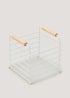 Keep your kitchen worktops neatly organised with this white metal caddy. A square wire design surrounds a caged base and is topped with two wood-effect handles for added practicality. Dimensions: 18.5cm x 18.5cm.