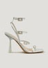 Elevate your outfits and look fierce doing so with these gorgeous heels from the chic Be Beau collection. Styled in sophisticated silver and featuring 4 sparkly buckle details to the slim straps, this secure and sturdy pair will look amazing with dresses and jumpsuits alike. Online exclusive. Heel Height: Approx 5 Inch.