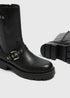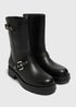 Learn moreStride confidently in our black biker boots, designed to elevate your everyday style with an edgy, commanding presence. With silver detailing on the buckles and a chunky sole with a low heel, these boots have an edgy and cool look. The chunky sole and longer style boots ensure a cosy and comfortable all day wear. Pair with a dress for a dressed up look or pair with jeans and a t-shirt for a cool and casual look.