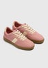 Step up your casual footwear game with these blush pink retro-inspired trainers, perfect for adding a playful, vintage sports vibe to your everyday outfits. Crafted from soft faux suede, they feature a classic lace-up front and a contrasting tan sole for a timeless, stylish finish. Designed for comfort and versatility, these trainers keep your look effortlessly sharp from morning to evening.