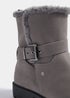 Learn moreRound off your autumn/winter looks with these chic grey biker boots. Lined with snuggly faux fur, they feature edgy buckle accents and a side zipper for easy on and off. The cleated sole provides traction and comfort, making them perfect for your cold-weather adventures. Whether paired with jeans or a dress, staying stylish is an absolute breeze with this versatile pair.
