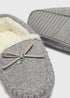 Learn moreThese Grey Mocassin Slippers are the perfect way to add a touch of comfort to your everyday lounge look. Crafted from a shimmery metallic fabric, they'll catch the light beautifully and make you stand out from the crowd. Finished with a suede bow and star charm. The plush white faux-fur lining provides added comfort and warmth, while the durable rubber sole ensures long-lasting wear.